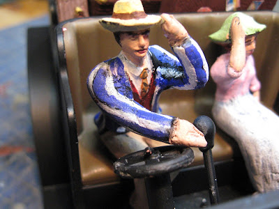 I have decided that the female figure will be one of the daughters of Lord Tollemache (from Peckforton Castle) and so the car depicts the Hon Frances Tollemache using the car to return in style from one of her foreign holidays with her new beau.
